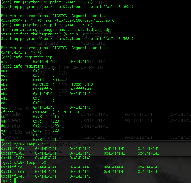 info registers eip --> to see if the EIP is overwrite by 41414141